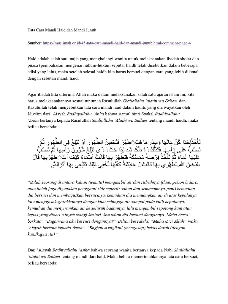 Doa Mandi Junub Dan Urutan Tata Cara Yang Benar from wisatanabawi.com Nah, itu tadi adalah tata cara mandi wajib yang benar sesuai dengan ajaran agama. Ketika mandi sesuai masa haidh, seorang wanita disunnahkan membawa kapas atau potongan kain untuk mengusap tempat keluarnya darah guna menghilangkan. Berikut kita akan melihat tata cara mandi yang disunnahkan.